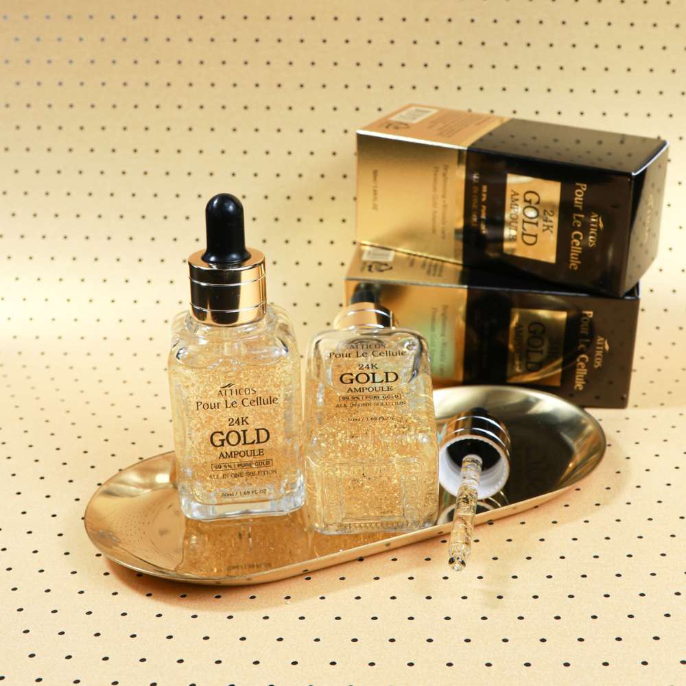 Meet the ATTICOS Pour Le Cellule 24K GOLD Ampoule, your luxurious shortcut to firmer, brighter, and deeply hydrated skin. This powerful serum combines real 24K gold with skin-firming peptides to tackle signs of aging and restore your youthful radiance from the very first drop.