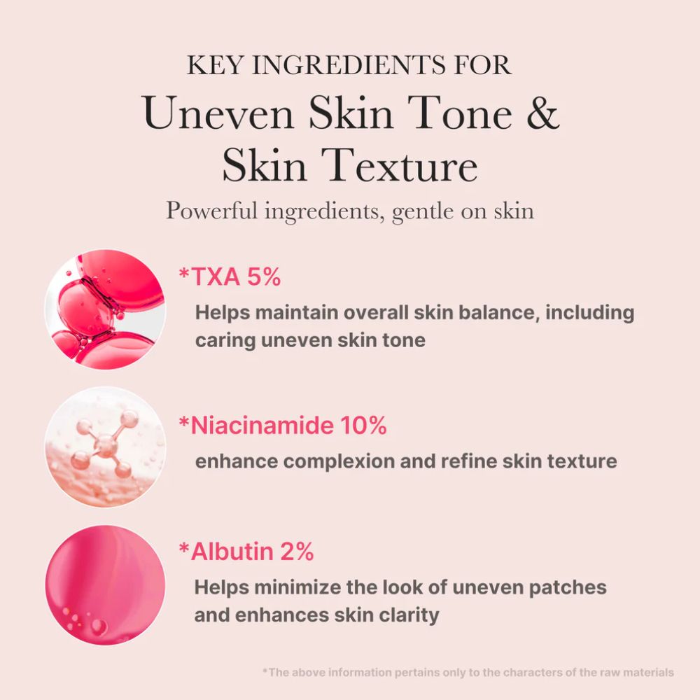 • Tranexamic Acid (TXA): The pigmentation powerhouse. TXA specifically targets the pathways that create dark spots, effectively fading existing discoloration and helping to prevent new ones from forming.