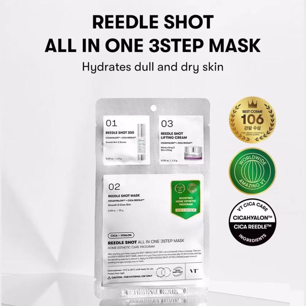 Unlock your skin’s true potential with the VT – Reedle Shot All In One 3 Step Mask! This isn’t just a sheet mask; it’s a revolutionary 3-step facial that uses tiny CICA-infused ‘needles’ to help your skincare work harder and deliver glass skin results, faster.